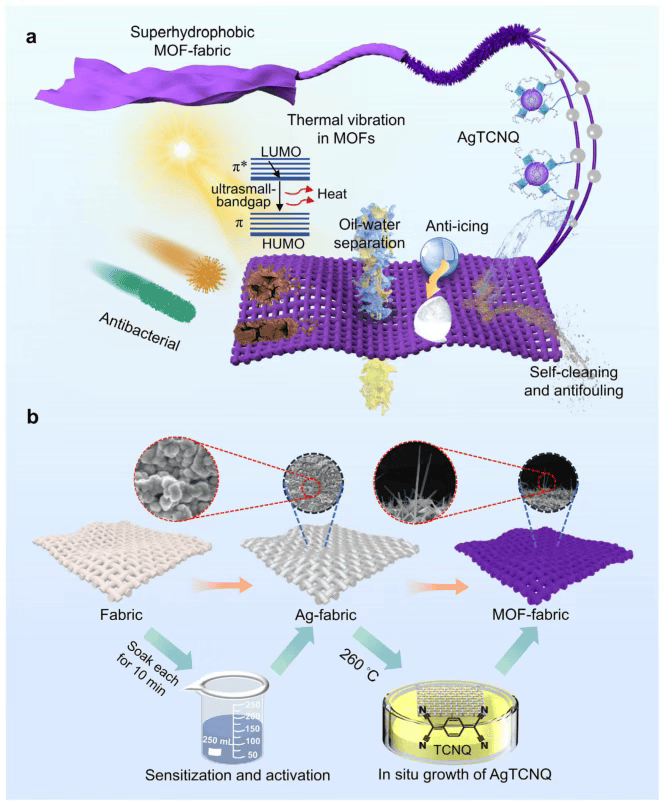 该织物仿圣人掌刺构造,成效先辈,正在众范围操纵前景广,收获于9月7日颁发于《先辈纺织原料》。这项探求通过仿生打算、原位自拼装和超小带隙工程,告成将众成效本能集成于简单纺织品平台,实行了超疏水、抗冰、抗菌、光热转换和油水散开的高度协同。办理古代MOF-纺织品瓶颈,为智能纺织品特别境遇操纵供给途途。