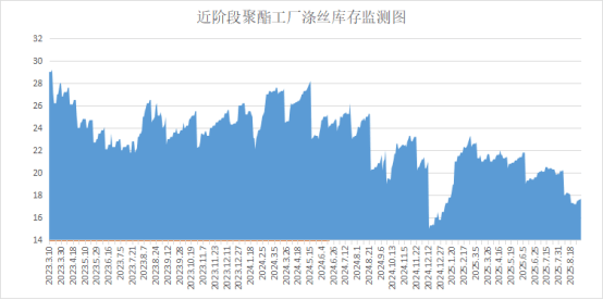 库存方面,按照绸都网统计数据来看,现目前聚酯墟市举座库存荟萃正在16-26天;详细产物方面,个中POY库存至16-27天,FDY库存至14-26天相近,而DTY库存则至15-27天掌握。